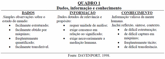 A gestão do conhecimento trata justamente de fatores críticos de sucesso organizacional: informação e conhecimento. Davenport (1998) apresenta uma estruturação compreensiva do processo estruturado de análise de dados-informação-conhecimento (quadro 1):